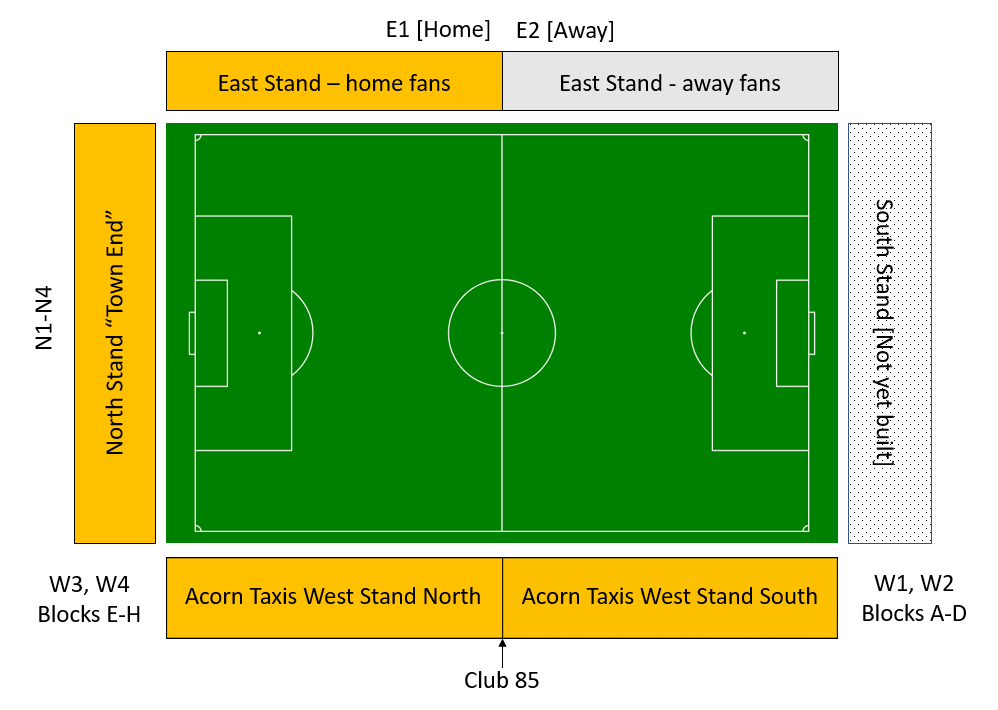 The North Stand (also unofficially known as the new Town End) | 2022/2023 admission price: £14 adults, £11 concessions, £5 u16s | Accessed via turnstiles N1-N4